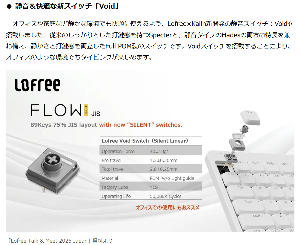 Kailh Choc v2系なので選択肢は少ないところではあるが、仕事場に持っていこうと思って購入したLofree Lite JISから標準装備されたVoidという静音リニアを引っこ抜いて換装した。LofreeのほうがHadesを突っ込んだので職場での打鍵音は問題はない。なにせ自宅より職場の騒音のほうがひどいからなWeb会議で大声でしゃべるなら余所でやってくれんかね。
